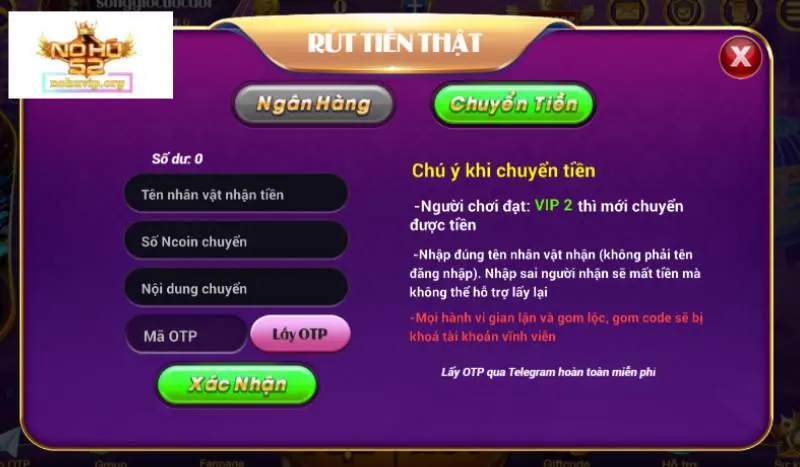 Bạn hãy thử kiểm tra xem mình đã đạt điều kiện mà cổng game đưa ra chưa. Cụ thể là tài khoản Nohu52 này của bạn phải đạt từ trình độ VIP 2 trở lên. Và số tiền bạn rút về phải thấp hơn số tiền hiện tại có mặt trong tài khoản cổng game.